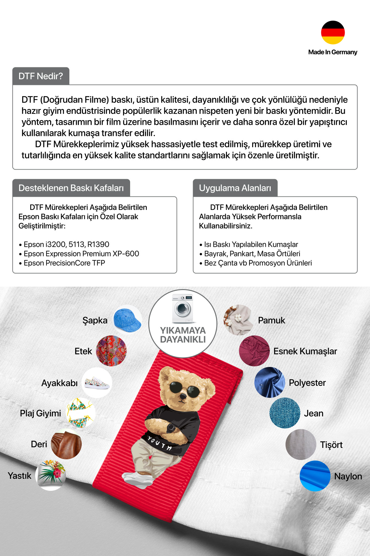 Not: Bu DTF mürekkep ürünü orijinal bir ürün değildir ve yazıcı üreticisi tarafından üretilmemiştir. Tüm marka isimleri ve ticari markalar ilgili sahiplerinin mülkiyetindedir ve sadece referans amaçlı kullanılmıştır.