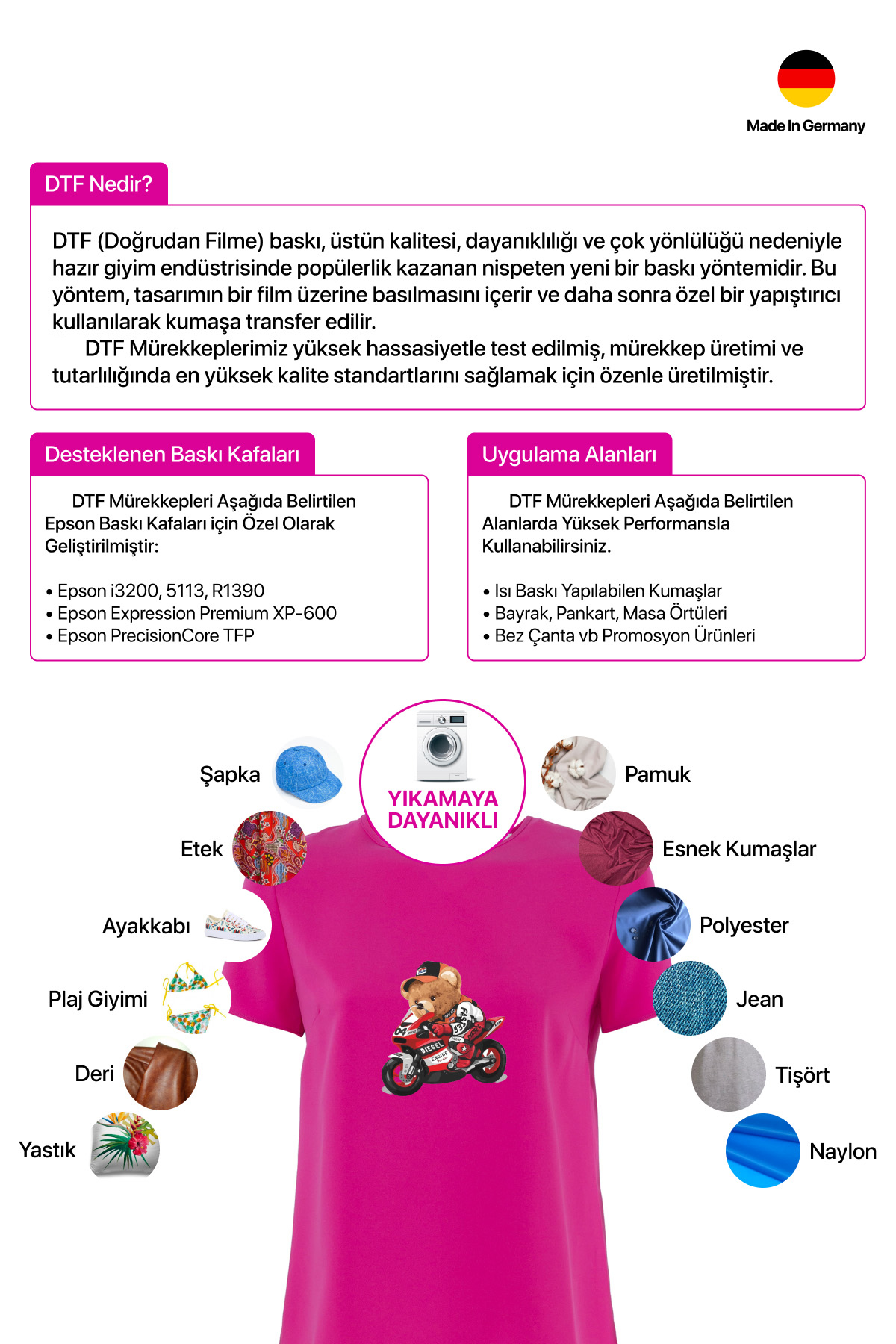 Not: Bu DTF mürekkep ürünü orijinal bir ürün değildir ve yazıcı üreticisi tarafından üretilmemiştir. Tüm marka isimleri ve ticari markalar ilgili sahiplerinin mülkiyetindedir ve sadece referans amaçlı kullanılmıştır.