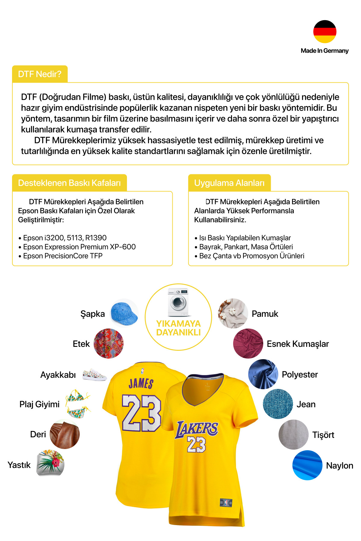 Not: Bu DTF mürekkep ürünü orijinal bir ürün değildir ve yazıcı üreticisi tarafından üretilmemiştir. Tüm marka isimleri ve ticari markalar ilgili sahiplerinin mülkiyetindedir ve sadece referans amaçlı kullanılmıştır.